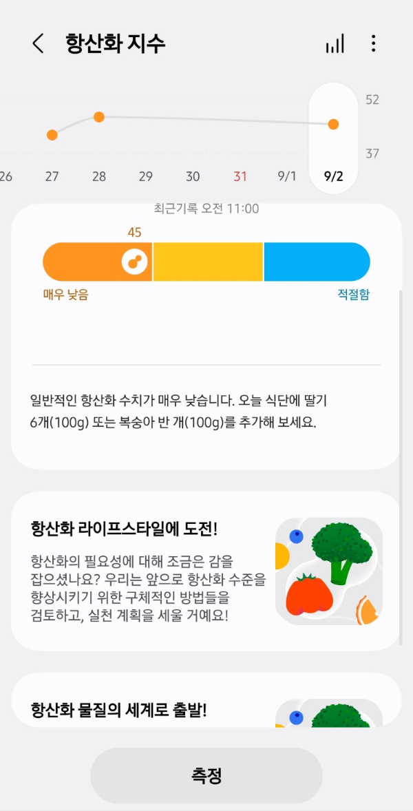 ➡ 실제 측정 화면입니다. 수치가 47, ‘매우 낮음’으로 나왔습니다. 단계별 색상으로 표시되기 때문에 직관적으로 확인이 가능했습니다.